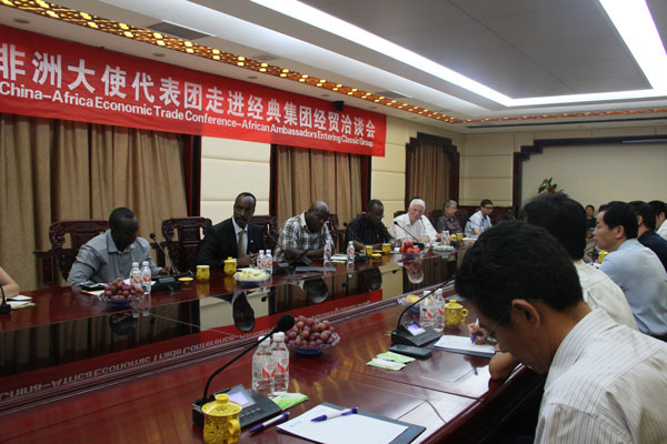 7月15日--17日由中國信息協(xié)會民營企業(yè)分會組織,盧旺達駐華使館查爾斯大使作為非洲經(jīng)貿(mào)考察團團長率領(lǐng)烏干達駐華大使、南蘇丹駐華公使、阿爾巴尼亞駐華大使以及盧旺達駐華商務(wù)參贊到經(jīng)典集團洽談業(yè)務(wù)合作。中國信息協(xié)會民營企業(yè)分會會長張鋁,國際部部長關(guān)偉娜,中國駐湯加王國前大使孫增森,經(jīng)典集團董事長苗樹文,總經(jīng)理杜福生及有關(guān)人員等陪同了此次活動。