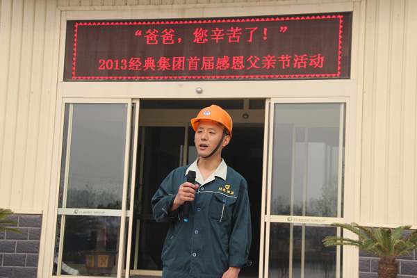 2013616日上午730分,經(jīng)典集團開展2013年度父親節(jié)“送溫暖,獻愛心”活動,為集團全體員工的父親送上愛心手機,千元節(jié)日紅包,集團董事長苗樹文,總經(jīng)理杜福生及高層領導先后致辭并發(fā)放獎金及手機。活動舉行完后,經(jīng)典集團總經(jīng)理杜福生親自到部分員工家中為員工父親送上集團的問候與節(jié)日祝福。